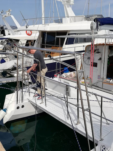 In the last weeks there was a lot to do and the "To do list" is far from finished, but we are slowly developing into a cruising yacht. After we were advised to install a wind generator in addition to our solar system, the first question was where to go with the thing. Since Katinka has a backstay, the wind generator on both hulls comes into the enclosure with them. So there remains only further into the middle and thus on a stanlees steel arch. Unfortunately there is such a equipment carrier for our boat not standard to buy. So we had to do our own crafts again.