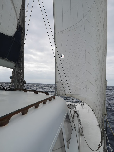 But the jet between Tenerife and Gran Canaria, is not long in coming and so not only my communication picks up speed, even our Katinka already shows 5 knots, on the plotter. Knowing that it winds in the south a bit more, we set the main in the first reef. In the meantime, Gaby is getting calmer and calmer and then stops communicating altogether. So I talk to the waves, the sky and especially to myself. Meanwhile we sail 6 knots and I get the genoa a bit tighter. The wind comes clearly from northeast. At least the wave sets to the south, so that it does not always crash against the port hull, but hits us diagonally from behind. We are now at 7 knots of speed and the wind has increased to 18 knots. Gran Canaria looms in the haze, while Tenerife is lost in the same. Foam crests on the crest of the wave, now and then a wave wants to know it nevertheless once, and crashes against the hull. This is then commented by me with all sorts of swear words.