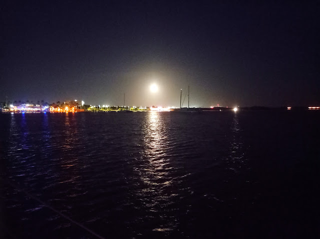 Finally, the discomfort pushes me out of bed and I look to see what's going on. The anchor alarm, which I let run at night via an app, has not triggered. I look at the position on my phone and realize everything is fine. I open the door to the cockpit, which I always keep closed while sleeping. Only now I realize that it is quite windy. The tarpaulin is flapping, the spinnaker trees are rattling in their holders and some halyard is whipping against the mast. The soundscape is deafening and the DJ's from last night would be happy they could generate such a volume with their bass speakers. I look over to the cruise pier, but the ship from the previous evening has already left, no trace of the giant pot. The pier is sparsely lit, and the only artificial light in the whole bay. I look up and see that the sky is cloudy. Every now and then the clouds break and the light of the moon penetrates to the surface of the water. The water is really boiling. Not that the wave is very high, on the contrary, but the wind stirs up the water and drives it ahead. In the short phases, when the moonlight falls on the water surface, it looks as if a white carpet has spread over the entire bay. Another jolt into the moorings draws my attention to the bow. Another squall causes the boat to vibrate and the background noise to increase into the infernal. The lines are under heavy tension and the anchor chain is taut at an alarming angle. Since there is a lot of space here in the bay and the wind blows mostly from easterly directions, we have put 30 meters of chain as a precaution. At two meters water depth, this is more than sufficient. Nevertheless, the stretched chain worries me and I go back to the salon to turn on the plotter and check the wind strength. I briefly consider deploying a second anchor, but quickly discard the thought.