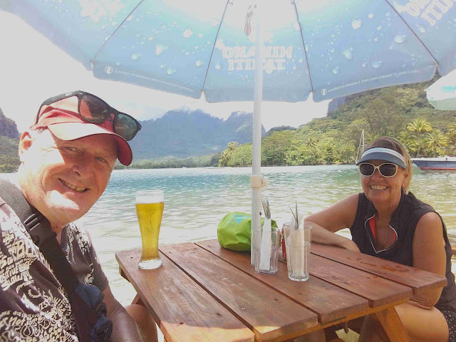 We then meet them at the Moorea Beach Bar and Snack. The small restaurant is located roughly in the middle of Opunohu Bay on the western shoreline. We take the dinghy again and drive the short distance across. I moor the dinghy to a tree that sticks far out into the water. The attraction of the beach bar is the seats in the water. There are rays and sharks swimming right next to you, which the guests attract with food. Admittedly, it feels a little queasy at first, but the animals are so full that they spurn the many legs in the water. After a short time, you get used to the fish. The fact that a ray doesn't need much water depth is somehow understandable due to its shape. I find it amazing that a shark can get into such shallow water. While the rays move quite comfortably through the water, the sharks are rather shy and can only be seen briefly. Despite their impressive size of a good 1.2 meters, they are cautious and sceptical of humans. Who knows what that's good for.